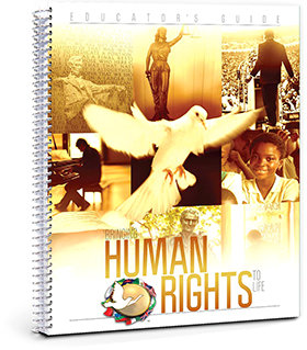 La Guía del Educador de Llevando los Derechos Humanos a la Vida es el núcleo del paquete educativo (arriba), conteniendo planes de lecciones, documentos de Derechos Humanos, procedimientos de denuncia, una lista de los organismos de Derechos Humanos, 30 anuncios de servicio público, la película La Historia de los Derechos Humanos y los folletos de La Historia de los Derechos Humanos.