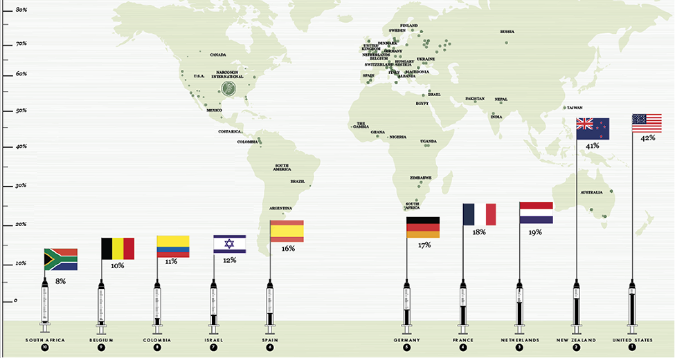 Los DIEZ PRIMEROS PAÍSES con el PORCENTAJE MÁS ELEVADO de la POBLACIÓN TOTAL que ha consumido DROGAS ILÍCITAS en algún momento de su vida