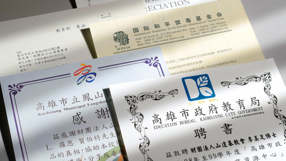 La filial de La Fundación por un Mundo Sin Drogas en Taiwán es una de las más activas del mundo: se contactaron a 1,1 millones de personas a través de 3.400 eventos informativos, la entrega de 700.000 folletos, la asistencia de 304.000 estudiantes a conferencias en 850 escuelas diferentes y anuncios de servicio público transmitidos en 50 canales de televisión a más de 5 millones de espectadores. Entre los partidarios y socios se incluyen concejales de la ciudad, legisladores, jefes de policía, alcaldes, el Ministerio de Educación y ONGs como la Fundación Internacional para la Eliminación Pacífica de los Cultivos de Opio.